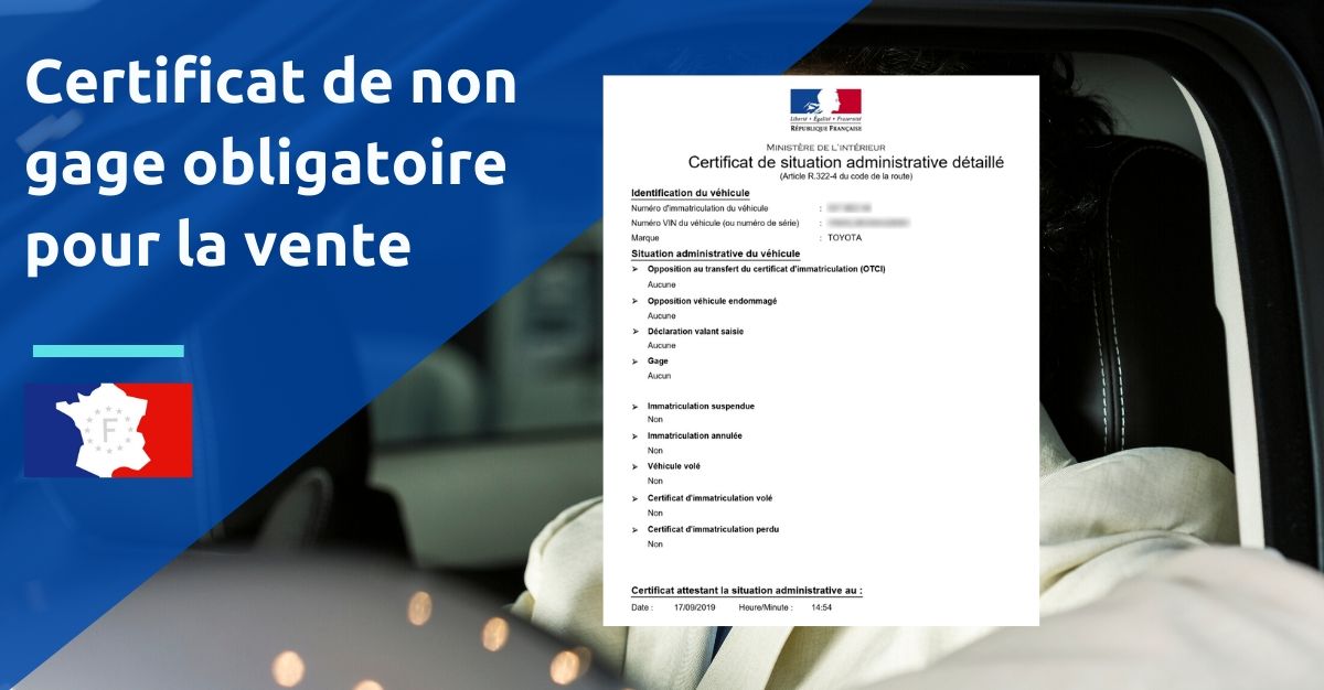 Le certificat de non-gage est-il obligatoire. Dernière mise à jour le 15/04/2024. Le certificat de non-gage, ou certificat de situation administrative est un document obligatoire à fournir à l'acquéreur dans le cadre de la vente d'un véhicule. Ce document permet de rendre compte de la situation administrative du véhicule.