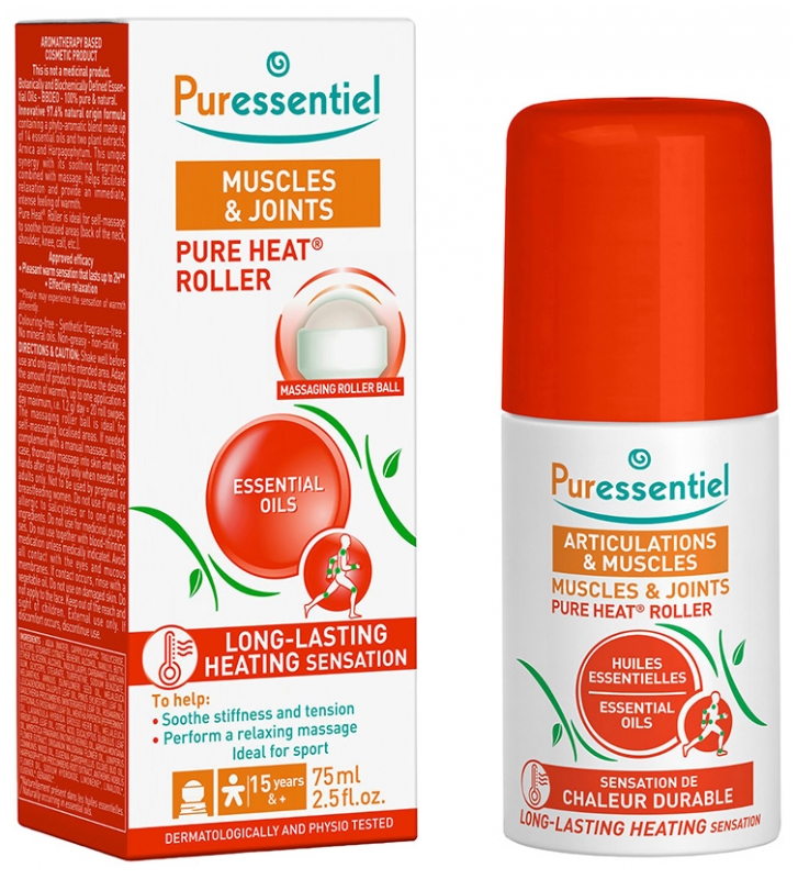 Muscles & Joints Pure Heat Roller. Puressentiel Muscles & Joint Pure Heat roller provides a long-lasting heating sensation to help: soothe stiffness and tension and perform a relaxing massage. Innovative 97.6% natural formula containing a phyto-aromatic blend made up of 14 essential oils and two plant extracts, Arnica and Harpagophytum. 75ml.